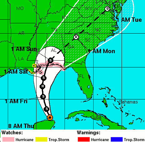 Tropical storm and hurricane watches are now in effect for a section of northern Gulf coast from New Orleans to Biloxi Mississippi, Mobile Alabama, Panama City and Pensacola Florida. Tropical storm conditions are expected to begin showing up in all of these areas as soon as late Friday afternoon.